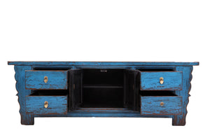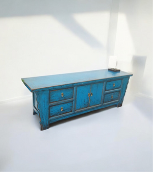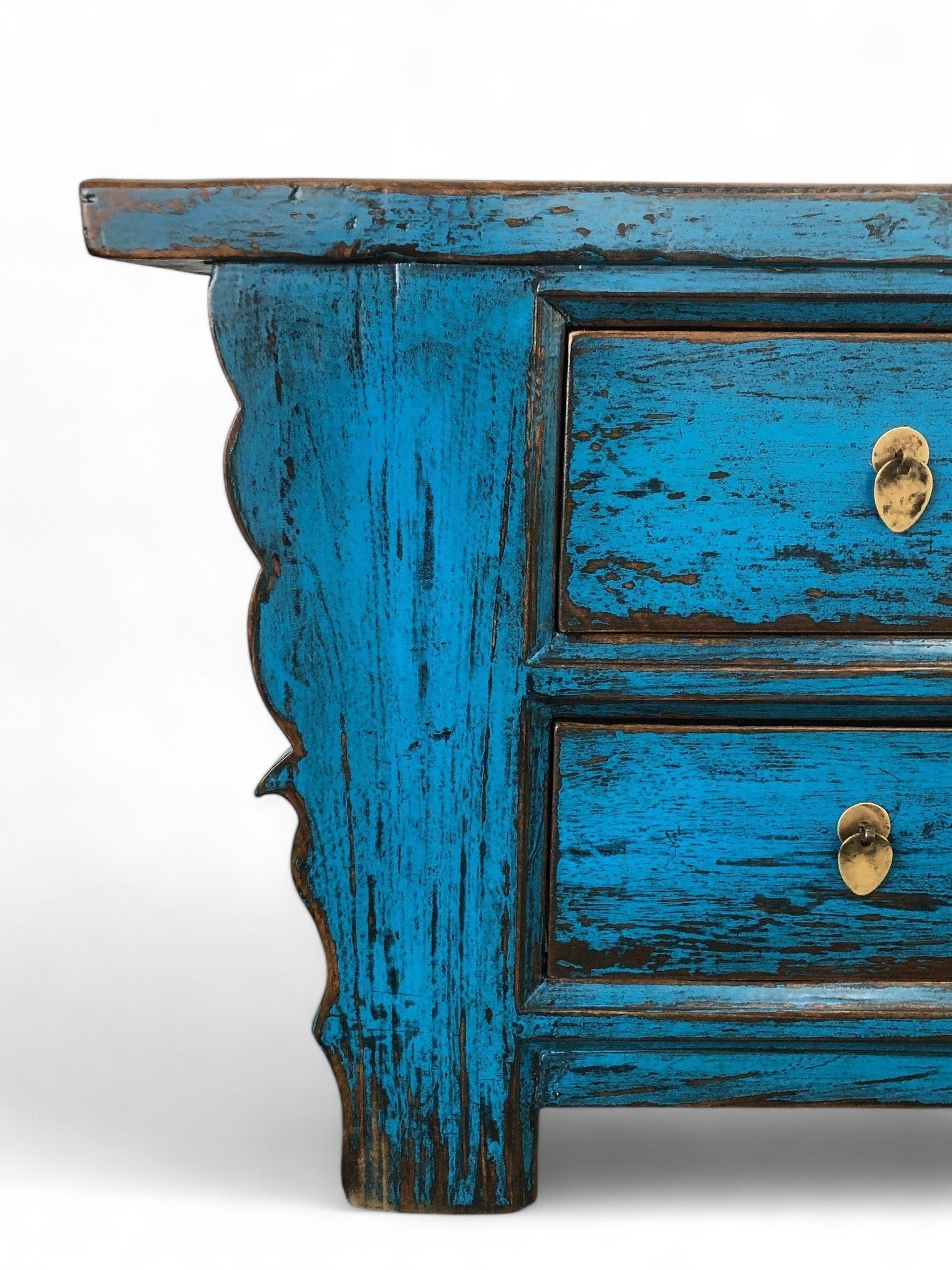 Schmuckvolles chinesisches Lowboard in leuchtendem Blau - ein echter Blickfang für jede Wohnung. Das Stück ist mit vier Schubladen und einem großen Stauraum in der Mitte ausgestattet, der wiederum durch einen herausnehmbaren Regalboden unterteilt ist. Darüber hinaus verfügt es über hochwertige Messinggriffe.