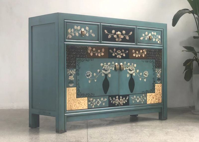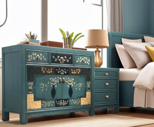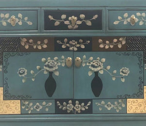 Chinesische Kommode in wunderschönem Blau und Beige aus unserer Produktlinie "Oceanflowers". Neben der Farbkomposition beeindrucken vor allem die kunstvollen Verzierungen und Blumenmuster. Auch bei diesem Sideboard haben wir unsere besondere New-looks-old-Technik eingesetzt. Oberflächen und Kanten wurden aufgeraut und geschliffen, damit sie den begehrten Shabby-Chic-Look erhalten. Insgesamt macht dies diese asiatische Schönheit zu einem ganz besonderen, individuellen Hingucker. Aufgrund seiner eher geringen Größe passt das Stück problemlos in jeden Raum.