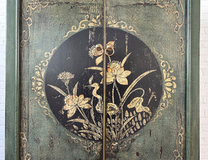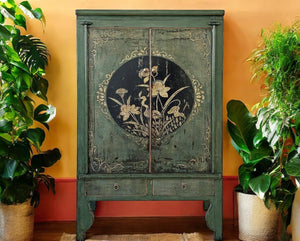 Dieser einzigartig schöne chinesische Hochzeitsschrank aus Pappelholz in Tannengrün ist ein echtes Highlight. Besonders die kreisrunde Verzierung in der Mitte verleiht dem Schrank seinen außergewöhnlichen asiatischen Charme. Durch seine kompakten Maße ist er zudem vielseitîg einsetzbar. Er verfügt über zwei herausnehmbare Einlegeböden, zwei Schubladen und bietet viel Stauraum.