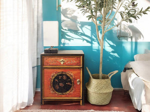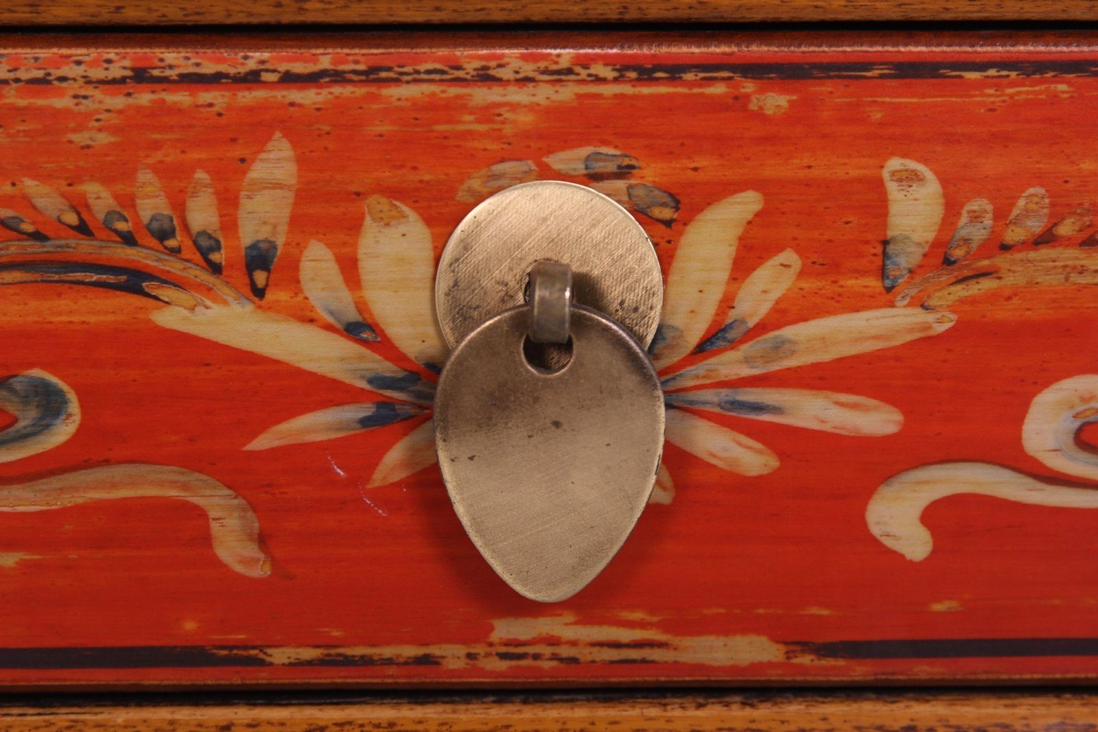 Hübscher chinesischer Nachttisch in exotischem Orange und Schwarz aus unserer Produktreihe "Coalflowers". Das Kästchen ist mit floralen Mustern und Ornamenten verziert. Diese verleihen dem Stück zusammen mit der Farbgebung das gewisse asiatische Ambiente, das wir versuchen allen unseren Möbeln einzuhauchen. Es besteht aus einer Schublade und einem Stauraum darunter. Diesen können Sie durch einen herausnehmbaren Einlegeboden nochmals unterteilen.