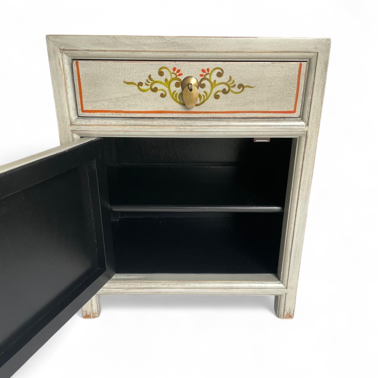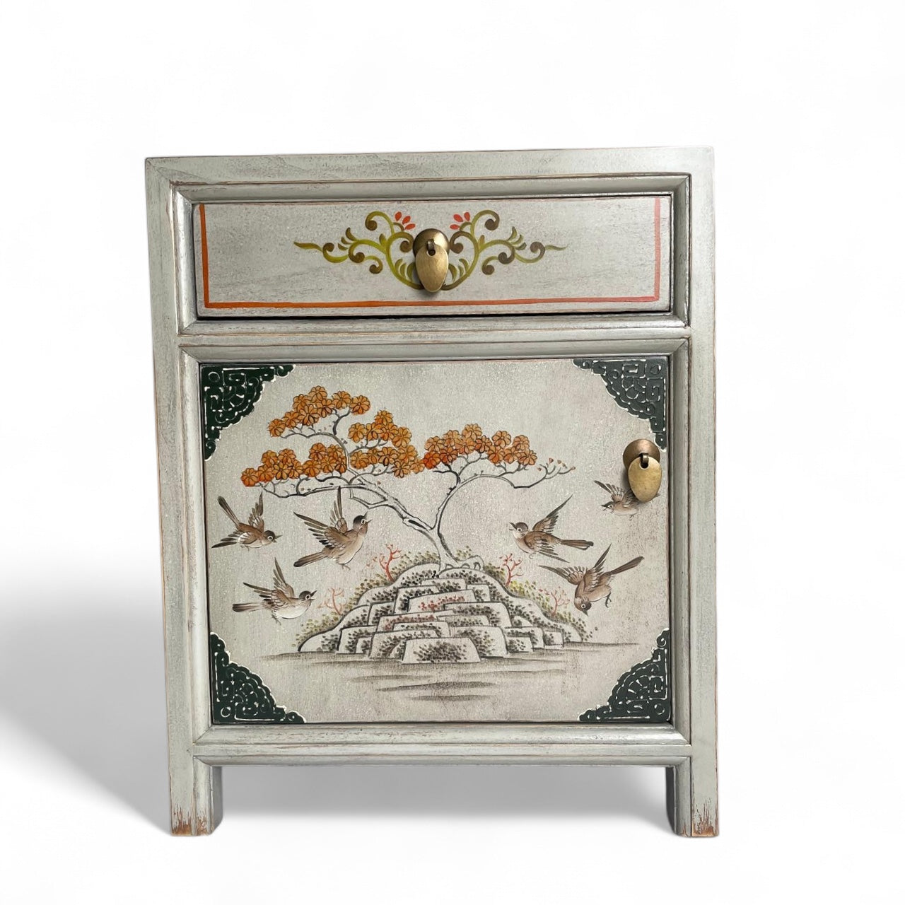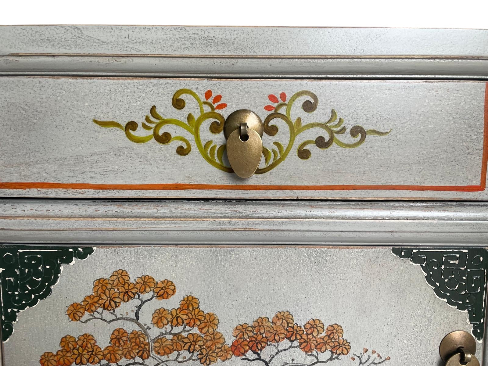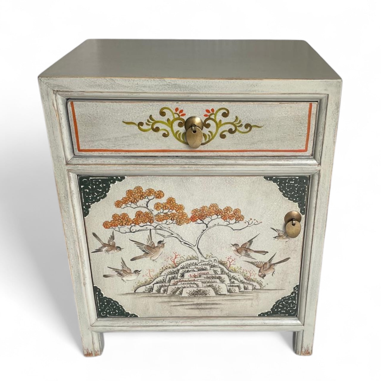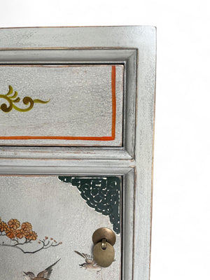 Chinesisches Nachtkästchen in stilvollem, modernen Weiß aus unserer Produktlinie "Vintagefog". Neben der Farbkomposition beeindrucken vor allem die kunstvollen Verzierungen und Naturmuster. Auch bei diesem Stück haben wir unsere besondere New-looks-old-Technik eingesetzt. Oberflächen und Kanten wurden aufgeraut und geschliffen, damit sie den begehrten Shabby-Chic-Look erhalten.