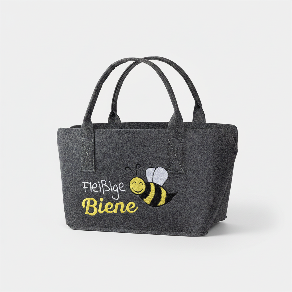 Machen Sie Ihren Einkauf zu einem echten Hingucker! Unsere hochwertige Filztasche in elegantem Dunkelgrau vereint Funktionalität mit einem charmanten Design. Die liebevolle Stickerei "Fleißige Biene" sorgt garantiert für ein Lächeln im Alltag – sei es im Supermarkt, auf dem Wochenmarkt oder als stilvolle Aufbewahrung zu Hause.