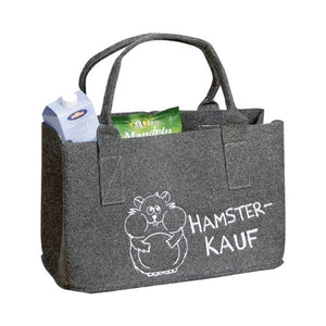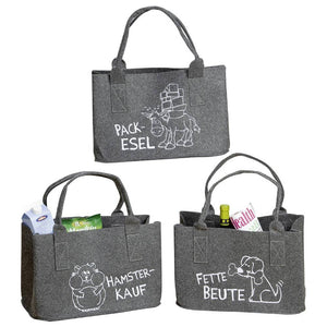Beschreibung: Filz-Tasche Smart Shopping dunkelgrau bestickt mit Tiermotif und Spruch: