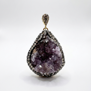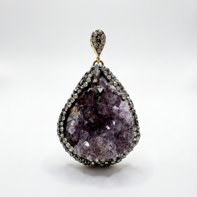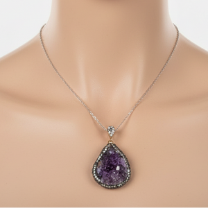Der massive Anhänger präsentiert das Herz einer echten Amethyst-Druse, eingefasst in einen funkelnden Rahmen. Dank der im Lieferumfang enthaltenen Kette ist dieses Schmuckstück sofort tragbereit. Mit einem spürbaren Gewicht von über 13 Gramm und einer statthaften Größe ist dieses Collier ein echtes Statement-Piece, das jedem Outfit eine mystische Aura verleiht.