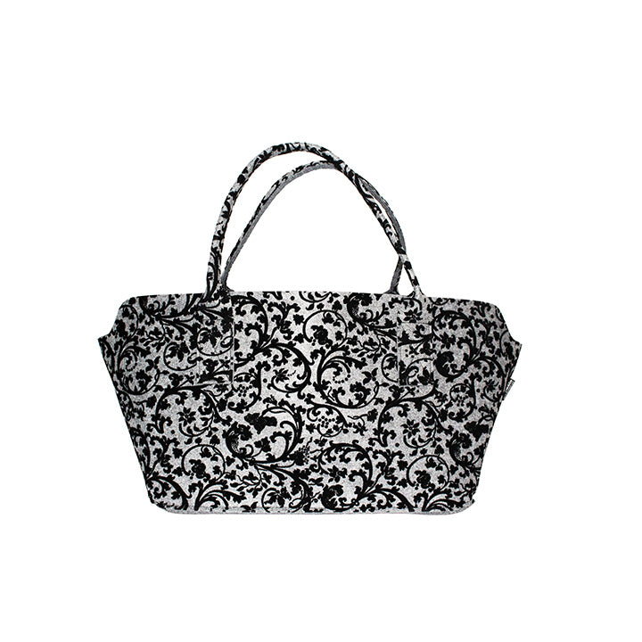 Eine elegante und geräumige Einkaufstasche aus weichem Filz mit einem zeitlosen Blumenmuster in Schwarz auf grauem Hintergrund. Perfekt für den stilbewussten Einkauf oder als modisches Accessoire.