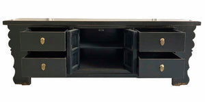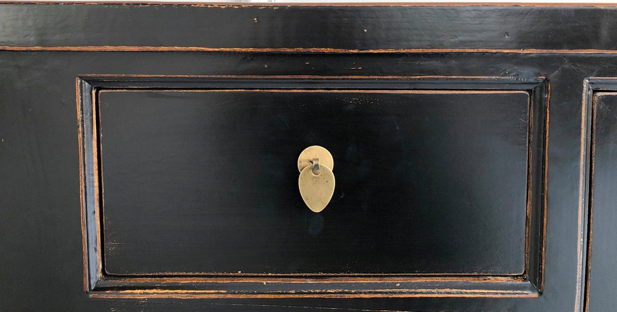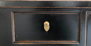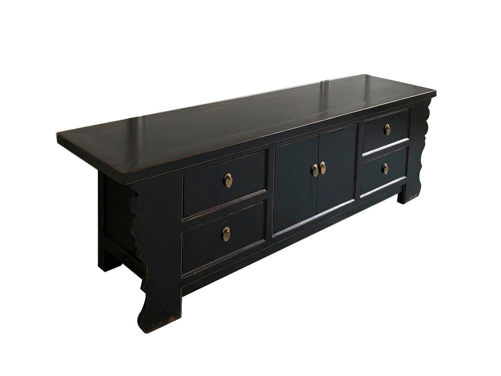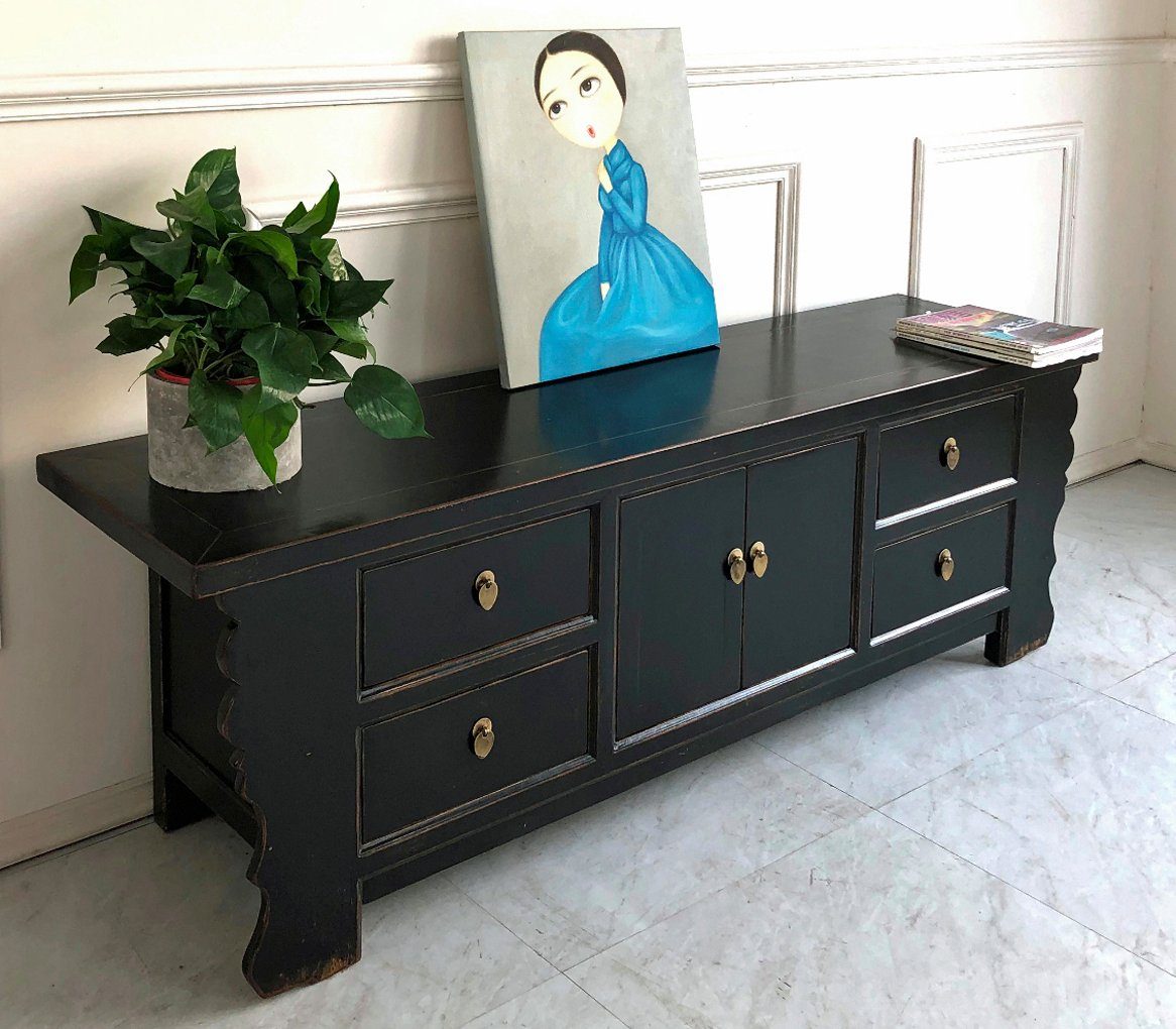Dezentes chinesisches Lowboard in klassischem Schwarz. Dieses Lowboard vereint minimalistisches Design mit verspielten asiatischen Formen und passt in jedes Interieur. Das Stück ist mit vier Schubladen und einem größeren Stauraum in der Mitte ausgestattet, der wiederum durch einen herausnehmbaren Regalboden unterteilt ist. Darüber hinaus verfügt es über hochwertige Messinggriffe.