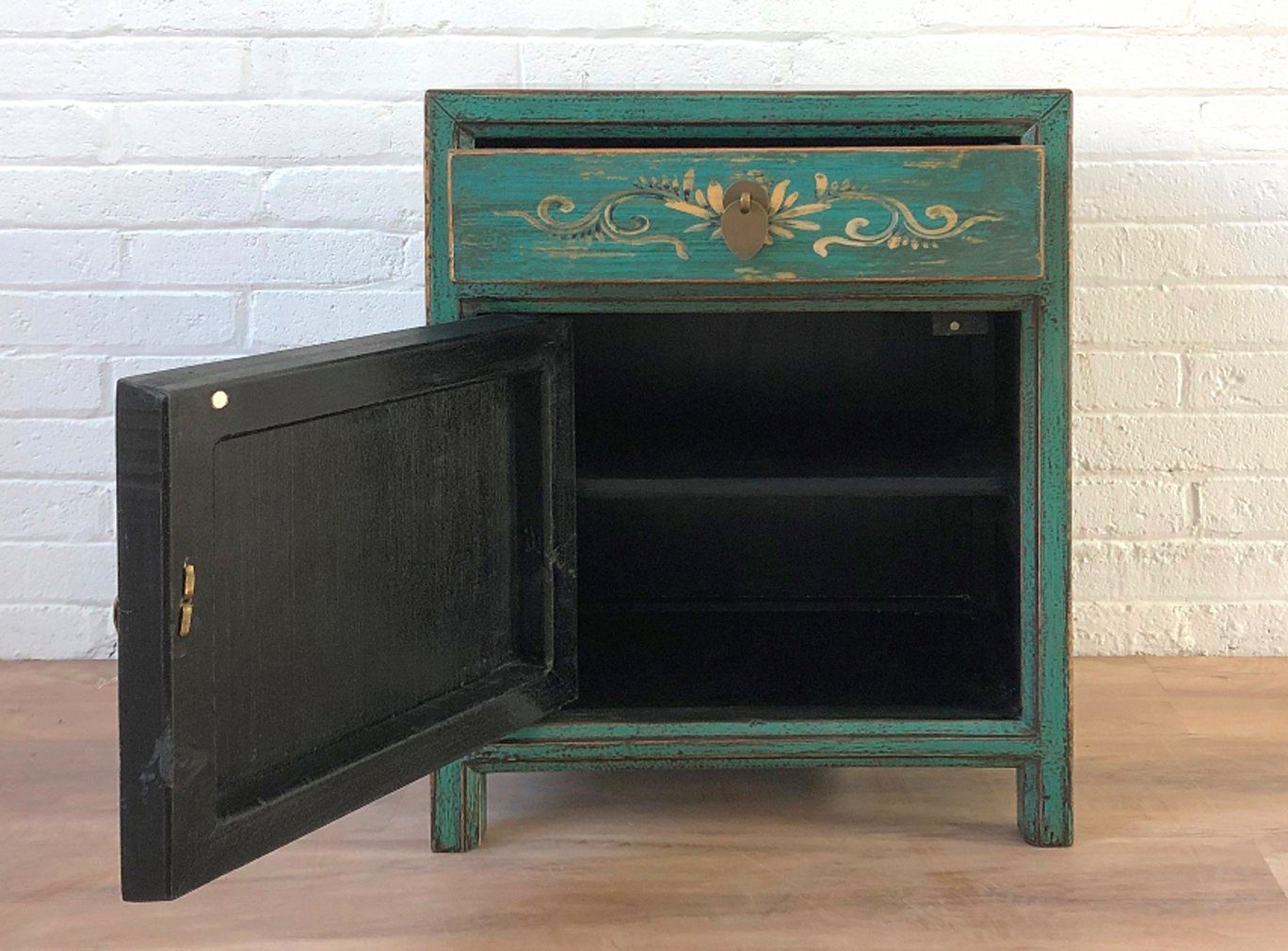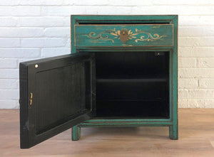 Schmuckvoller chinesischer Nachttisch in Grün und Beige aus unserer Produktreihe "Aurora". Das Kästchen ist mit floralen Mustern und Ornamenten verziert. Diese verleihen dem Stück zusammen mit der Farbgebung das gewisse asiatische Ambiente, das wir versuchen allen unseren Möbeln einzuhauchen. Es besteht aus einer Schublade und einem Stauraum darunter. Diesen können Sie durch einen herausnehmbaren Einlegeboden nochmals unterteilen.