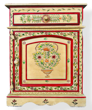 Handbemaltes Kästchen aus indischem Mangoholz in schmuckvollen Farben. Das Kästchen ist mit floralen Mustern und Ornamenten verziert. Diese verleihen dem Stück zusammen mit der Farbgebung das gewisse asiatische Ambiente, das wir versuchen allen unseren Möbeln einzuhauchen. Es besteht aus einer Schublade und einem Stauraum darunter.