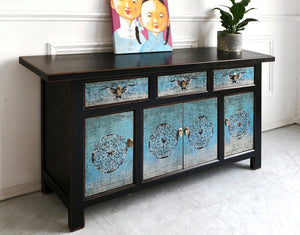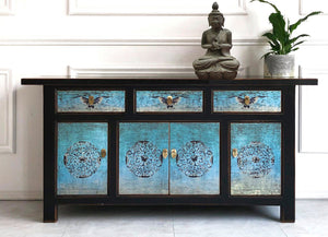 Wunderschöne orientalische Kommode in zerfließenden Blautönen mit kunstvollen Verzierungen. Auch bei diesem Sideboard haben wir unsere besondere New-looks-old-Technik eingesetzt: Oberflächen und Kanten wurden vorsichtig geschliffen, sodass sie den begehrten Shabby-Chic-Look erhalten. Insgesamt entsteht so ein einzigartiges Möbelstück, das jedem Raum ein asiatisches Flair verleiht.
